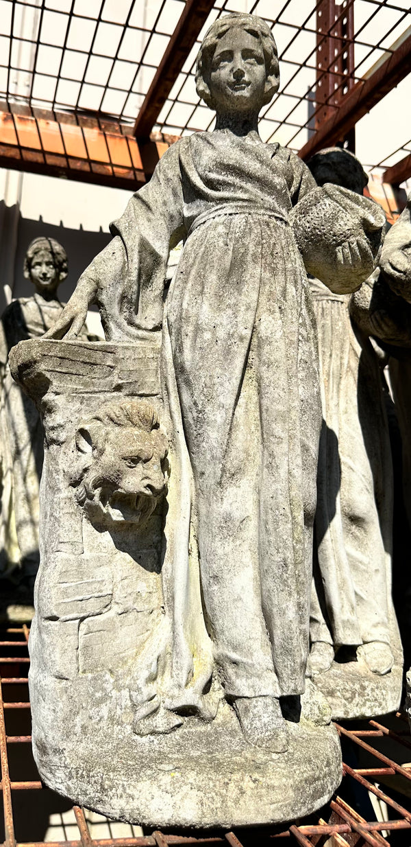 This product is a concrete garden statue depicting a woman figure holding a water vessel, standing next to the pedestal with a lion bust design. The statue adds a unique and artistic touch to any yard, garden, or outdoor living space.