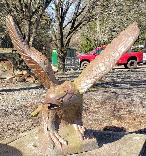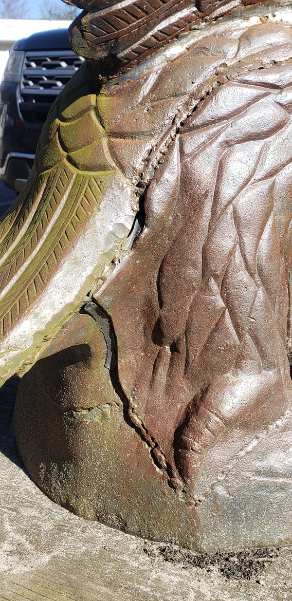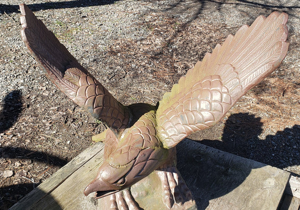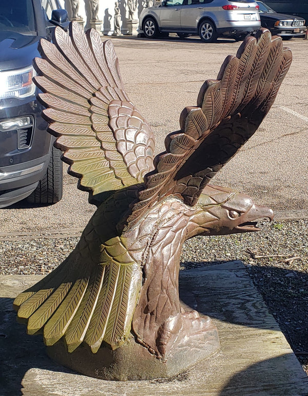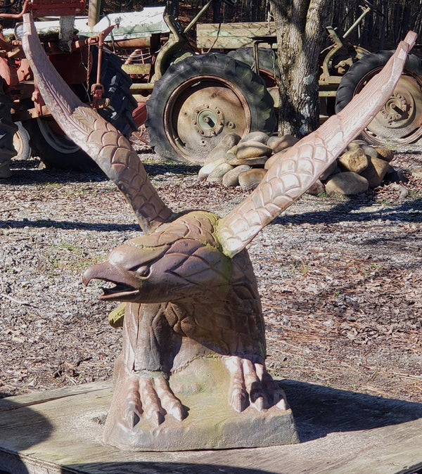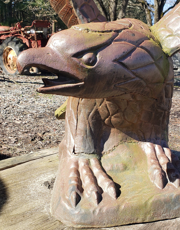 This eagle has some fantastic details in every inch. Crafted in solid cast iron with an open ornate wing span. The eagle is clutching his talons on a 16" x 16" bottom base so it's suitable to be placed on a supportive pedestal. It has been repaired and reinforced previously at some point (shown in pictures) and is very solid and stable.