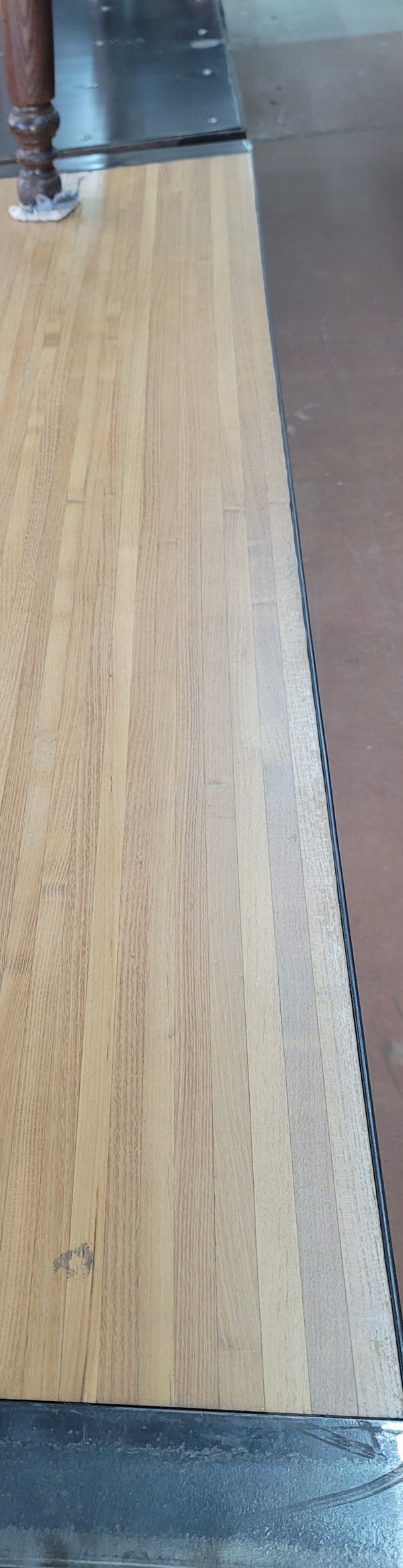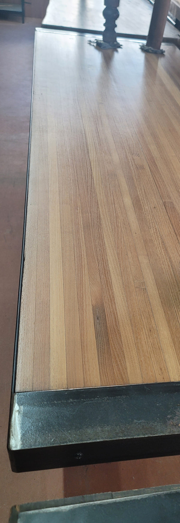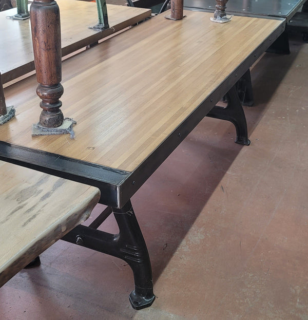 Custom made from our shop using reclaimed bowling alley flooring obtained from a local southside VA business. The top surface was cleaned then clear coated along with capping all sides with a thick band of steel. It is attached to a pair of industrial cast iron legs with a center iron brace. The bottom base was also painted black.