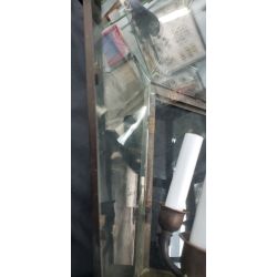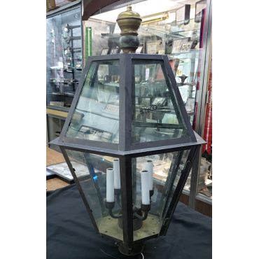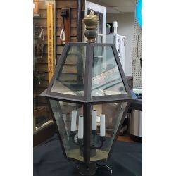 This large post light has been restored with new wiring and a new 4 piece interior candelabra set. The frame is brass and has a ball and point brass top finial. Each pane of glass is individually held into the fixture with interior metal clips. The bottom pole fitter size is for a 3" pole. The fixture measures 29" tall and 17" in diameter. One part of the brass frame at the center is a bit warped and shown in pictures. Ready to install.